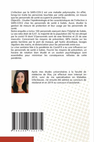 L'infection par le SARS-COV-2 est une maladie polymorphe. En effet, lorsqu'on traite les personnes touchées par cette pandémie, on trouve que les personnels de santé occupent le premier lieu.Objectifs : Etudier l'épidémiologie et les caractéristiques de l'infection à SARS-COV2 chez les personnels de santé à Gabés. Aussi, étudier la gestion de mesure de protection et leur usage par les personnels de santé.Notre enquête a inclus 100 personnels exerçant dans l'hôpital de Gabés. La sex-ratio était de 0,47. la majorité de la population (82 %) est attrapé par le covid-19 dont 57personnels sont de sexe féminine et 25 de sexe masculin. Concernant les moyens de prévention, 68% insiste sur les gestes barrières par le port de masque, gel hydro alcoolique, lavages réguliers des mains, et distanciation pour les personnels entre eux.La crise sanitaire liée à la pandémie du Covid19 a eu une influence sur les personnels de santé à Gabes. Fournir les moyens de prévention, un horaire de rotation bien étudié et un soutien psychologique sont essentielles pour minimiser les conséquences néfastes de cette pandémie.