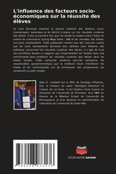 Ce livre fascinant examine le pouvoir prédictif des facteurs socio-économiques, parentaux et du district scolaire sur les résultats scolaires des élèves. C'est la première fois que l'on étudie la relation entre l'indice du salaire de subsistance (Living Wage Index - LWI) et les résultats des élèves aux tests standardisés. Cette publication montre que des mesures autres que les tests standardisés devraient être utilisées pour élaborer des politiques concernant les résultats scolaires des élèves. Il s'agit de l'une des premières études à suggérer que l'augmentation de l'emploi dans une communauté peut améliorer les résultats scolaires des élèves dans les écoles locales. Cette recherche novatrice pourrait convaincre les responsables gouvernementaux que la meilleure façon d'améliorer les écoles et les communautés est de promouvoir des programmes qui conduisent au plein emploi.