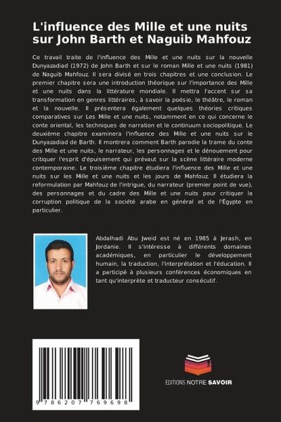 Ce travail traite de l'influence des Mille et une nuits sur la nouvelle Dunyazadiad (1972) de John Barth et sur le roman Mille et une nuits (1981) de Naguib Mahfouz. Il sera divisé en trois chapitres et une conclusion. Le premier chapitre sera une introduction théorique sur l'importance des Mille et une nuits dans la littérature mondiale. Il mettra l'accent sur sa transformation en genres littéraires, à savoir la poésie, le théâtre, le roman et la nouvelle. Il présentera également quelques théories critiques comparatives sur Les Mille et une nuits, notamment en ce qui concerne le conte oriental, les techniques de narration et le continuum sociopolitique. Le deuxième chapitre examinera l'influence des Mille et une nuits sur le Dunyazadiad de Barth. Il montrera comment Barth parodie la trame du conte des Mille et une nuits, le narrateur, les personnages et le dénouement pour critiquer l'esprit d'épuisement qui prévaut sur la scène littéraire moderne contemporaine. Le troisième chapitre étudiera l'influence des Mille et une nuits sur les Mille et une nuits et les jours de Mahfouz. Il étudiera la reformulation par Mahfouz de l'intrigue, du narrateur (premier point de vue), des personnages et du cadre des Mille et une nuits pour critiquer la corruption politique de la société arabe en général et de l'Égypte en particulier.