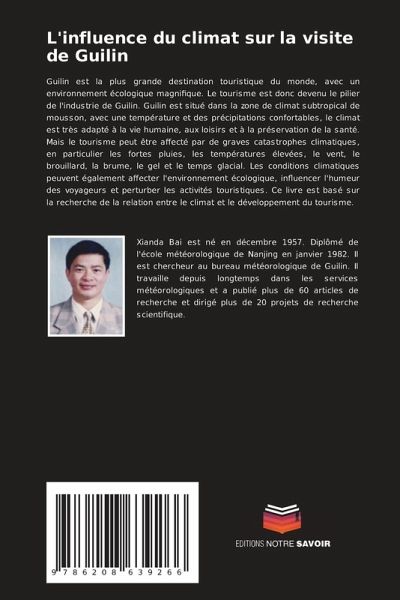 Guilin est la plus grande destination touristique du monde, avec un environnement écologique magnifique. Le tourisme est donc devenu le pilier de l'industrie de Guilin. Guilin est situé dans la zone de climat subtropical de mousson, avec une température et des précipitations confortables, le climat est très adapté à la vie humaine, aux loisirs et à la préservation de la santé. Mais le tourisme peut être affecté par de graves catastrophes climatiques, en particulier les fortes pluies, les températures élevées, le vent, le brouillard, la brume, le gel et le temps glacial. Les conditions climatiques peuvent également affecter l'environnement écologique, influencer l'humeur des voyageurs et perturber les activités touristiques. Ce livre est basé sur la recherche de la relation entre le climat et le développement du tourisme.