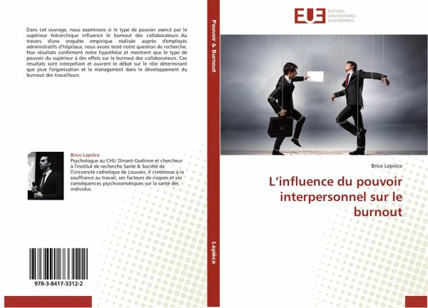 Dans cet ouvrage, nous examinons si le type de pouvoir exercé par le supérieur hiérarchique influence le burnout des collaborateurs. Au travers d'une enquête empirique réalisée auprès d'employés administratifs d hôpitaux, nous avons testé notre question de recherche. Nos résultats confirment notre hypothèse et montrent que le type de pouvoir du supérieur à des effets sur le burnout des collaborateurs. Ces résultats sont interpellant et ouvrent le débat sur le rôle déterminant que joue l'organisation et le management dans le développement du burnout des travailleurs.