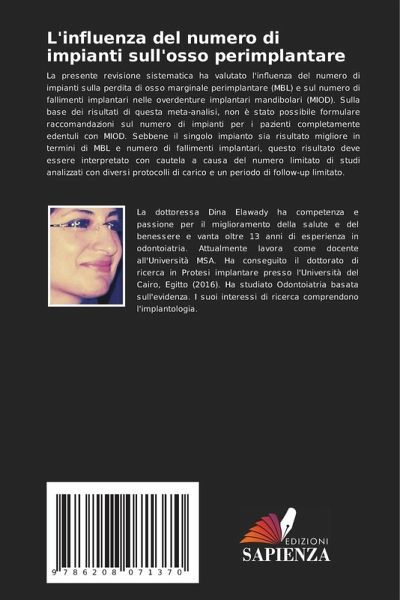 La presente revisione sistematica ha valutato l'influenza del numero di impianti sulla perdita di osso marginale perimplantare (MBL) e sul numero di fallimenti implantari nelle overdenture implantari mandibolari (MIOD). Sulla base dei risultati di questa meta-analisi, non è stato possibile formulare raccomandazioni sul numero di impianti per i pazienti completamente edentuli con MIOD. Sebbene il singolo impianto sia risultato migliore in termini di MBL e numero di fallimenti implantari, questo risultato deve essere interpretato con cautela a causa del numero limitato di studi analizzati con diversi protocolli di carico e un periodo di follow-up limitato.