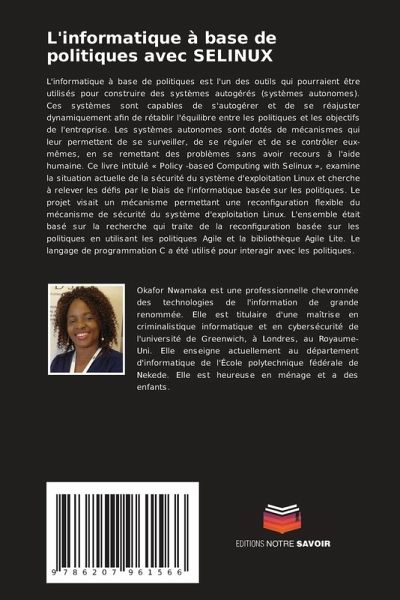 L'informatique à base de politiques est l'un des outils qui pourraient être utilisés pour construire des systèmes autogérés (systèmes autonomes). Ces systèmes sont capables de s'autogérer et de se réajuster dynamiquement afin de rétablir l'équilibre entre les politiques et les objectifs de l'entreprise. Les systèmes autonomes sont dotés de mécanismes qui leur permettent de se surveiller, de se réguler et de se contrôler eux-mêmes, en se remettant des problèmes sans avoir recours à l'aide humaine. Ce livre intitulé « Policy -based Computing with Selinux », examine la situation actuelle de la sécurité du système d'exploitation Linux et cherche à relever les défis par le biais de l'informatique basée sur les politiques. Le projet visait un mécanisme permettant une reconfiguration flexible du mécanisme de sécurité du système d'exploitation Linux. L'ensemble était basé sur la recherche qui traite de la reconfiguration basée sur les politiques en utilisant les politiques Agile et la bibliothèque Agile Lite. Le langage de programmation C a été utilisé pour interagir avec les politiques.