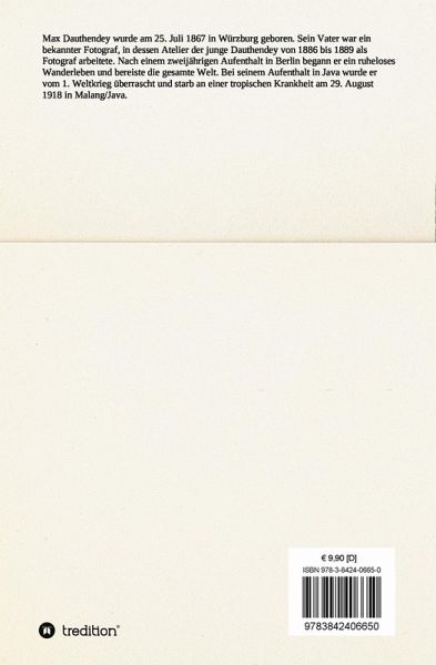 Max Dauthendey wurde am 25. Juli 1867 in Würzburg geboren. Sein Vater war ein bekannter Fotograf, in dessen Atelier der junge Dauthendey von 1886 bis 1889 als Fotograf arbeitete. Nach einem zweijährigen Aufenthalt in Berlin begann er ein ruheloses Wanderleben und bereiste die gesamte Welt. Bei seinem Aufenthalt in Java wurde er vom 1. Weltkrieg überrascht und starb an einer tropischen Krankheit am 29. August 1918 in Malang/Java.