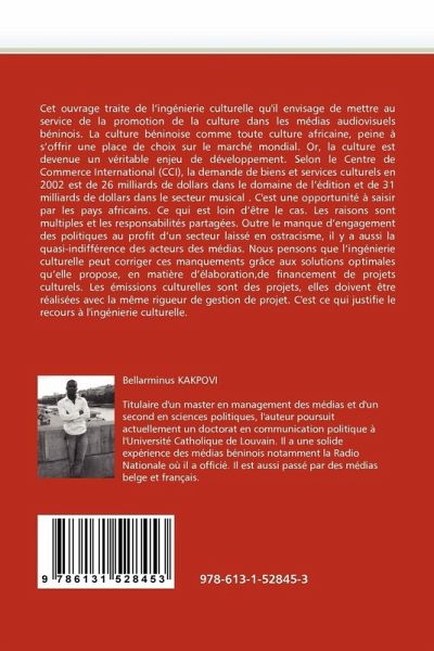 Cet ouvrage traite de l ingénierie culturelle qu'il envisage de mettre au service de la promotion de la culture dans les médias audiovisuels béninois. La culture béninoise comme toute culture africaine, peine à s offrir une place de choix sur le marché mondial. Or, la culture est devenue un véritable enjeu de développement. Selon le Centre de Commerce International (CCI), la demande de biens et services culturels en 2002 est de 26 milliards de dollars dans le domaine de l édition et de 31 milliards de dollars dans le secteur musical . C'est une opportunité à saisir par les pays africains. Ce qui est loin d être le cas. Les raisons sont multiples et les responsabilités partagées. Outre le manque d engagement des politiques au profit d un secteur laissé en ostracisme, il y a aussi la quasi-indifférence des acteurs des médias. Nous pensons que l ingénierie culturelle peut corriger ces manquements grâce aux solutions optimales qu elle propose, en matière d élaboration,de financement de projets culturels. Les émissions culturelles sont des projets, elles doivent être réalisées avec la même rigueur de gestion de projet. C'est ce qui justifie le recours à l'ingénierie culturelle.