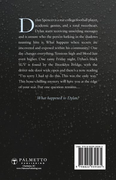 Dylan Spencer is a star college football player, academic genius, and a total sweetheart. Dylan starts receiving unsettling messages and is unsure who the person lurking in the shadows taunting him is. What happens when secrets are uncovered and exposed within his community? One day changes everything. Tensions high and blood lust even higher. One rainy Friday night, Dylan's black SUV is found by the Brooklyn Bridge, with the driver side door wide open and there's a note reading "I'm sorry I had to do this. This was the only way." This bone-chilling mystery will have you at the edge of your seat. But one question remains... What happened to Dylan?