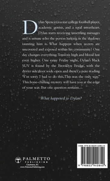 Dylan Spencer is a star college football player, academic genius, and a total sweetheart. Dylan starts receiving unsettling messages and is unsure who the person lurking in the shadows taunting him is. What happens when secrets are uncovered and exposed within his community? One day changes everything. Tensions high and blood lust even higher. One rainy Friday night, Dylan's black SUV is found by the Brooklyn Bridge, with the driver side door wide open and there's a note reading "I'm sorry I had to do this. This was the only way." This bone-chilling mystery will have you at the edge of your seat. But one question remains... What happened to Dylan?