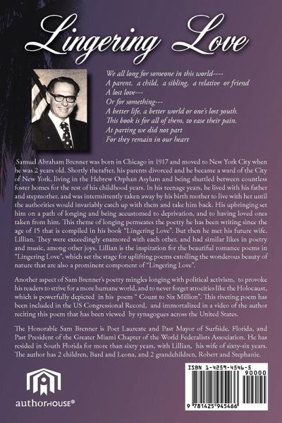 Samuel Abraham Brenner was born in Chicago in 1917 and moved to New York City when he was 2 years old. Shortly therafter, his parents divorced and he became a ward of the City of New York, living in the Hebrew Orphan Asylum and being shuttled between countless foster homes for the rest of his childhood years. In his teenage years, he lived with his father and stepmother, and was intermittently taken away by his birth mother to live with her until the authorities would invariably catch up with them and take him back. His upbringing set him on a path of longing and being accustomed to deprivation, and to having loved ones taken from him. This theme of longing permeates the poetry he has been writing since the age of 15 that is compiled in his book "Lingering Love". But then he met his future wife, Lillian. They were exceedingly enamored with each other, and had similar likes in poetry and music, among other joys. Lillian is the inspiration for the beautiful romance poems in "Lingering Love", which set the stage for uplifting poems extolling the wonderous beauty of nature that are also a prominent component of "Lingering Love". Another aspect of Sam Brenner's poetry mingles longing with political activism, to provoke his readers to strive for a more humane world, and to never forget atrocities like the Holocaust, which is powerfully depicted in his poem " Count to Six Million". This riveting poem has been included in the US Congressional Record, and immortalized in a video of the author reciting this poem that has been viewed by synagogues across the United States. The Honorable Sam Brenner is Poet Laureate and Past Mayor of Surfside, Florida, and Past President of the Greater Miami Chapter of the World Federalists Association. He has resided in South Florida for more than sixty years, with Lillian, his wife of sixty-six years. The author has 2 children, Bard and Leona, and 2 grandchildren, Robert and Stephanie.