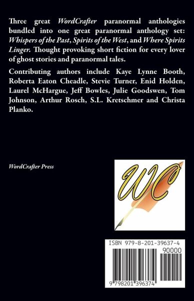 Three great WordCrafter paranormal anthologies bundled into one great paranormal anthology set: Whispers of the Past, Spirits of the West, and Where Spirits Linger. Thought provoking short fiction for every lover of ghost stories and paranormal tales. Contributing authors include Kaye Lynne Booth, Roberta Eaton Cheadle, Stevie Turner, Enid Holden, Laurel McHargue, Jeff Bowles, Julie Goodswen, Tom Johnson, Arthur Rosch, S.L. Kretschmer and Christa Planko,
