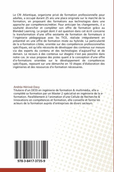 Le CRI Atlantique, organisme privé de formation professionnelle pour adultes, a occupé durant 25 ans une place originale sur le marché de la formation, en proposant des formations aux technologies dans une approche par compétences/métier. Pour anticiper les changements, il a souhaité diversifier et compléter son offre de formation grâce au Blended Learning. Le projet dont il est question dans cet écrit concerne la transformation d une offre existante de formation de formateurs à l ingénierie pédagogique avec les TICE, réalisée intégralement en présentiel en une offre de formation mixte ou hybride. La particularité de la e-formation ciblée, orientée sur des compétences professionnelles spécifiques, est qu elle nécessite de développer des contenus sur mesure via des experts du contenu et des technologies d aujourd hui et de demain. Le recours à des contenus sur étagère n est pas possible dans notre cas. Je vous propose des pistes quant à la conception d une offre d e-formations orientées sur le développement de compétences spécifiques, reposant sur une démarche en 10 étapes d élaboration des ingénieries et des ressources d e-formation nécessaires.