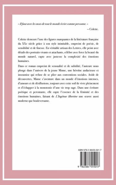 Il faut avec les mots de tout le monde écrire comme personne. - Colette.Colette demeure l'une des figures marquantes de la littérature française du XXe siècle grâce à son style inimitable, empreint de poésie, de sensibilité et de finesse. En véritable artisan des Lettres, elle peint avec détails des portraits vivants et attachants, célèbre avec force la beauté du monde naturel, capte avec justesse la complexité des émotions humaines. Dans ce roman empreint de sensualité et de subtilité, l'auteure nous plonge dans l'univers de la jeune Minne, une héroïne audacieuse et insoumise qui refuse de se plier aux conventions sociales. Avide de découvertes, Minne s'aventure dans un monde d'émotions intenses, d'amours et de désillusions, toujours avec cette soif de vivre pleinement et d'échapper à la monotonie d'une vie trop sage. Dans une écriture poétique et percutante, elle capte l'essence de la féminité et des émotions humaines, faisant de L'Ingénue libertine une uvre aussi moderne que bouleversante.