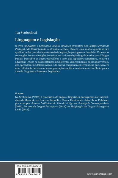 O livro Linguagem e Legislação. Análise sintático-semântica dos Códigos Penais de Portugal e do Brasil (estudo contrastivo-textual) oferece uma análise quantitativa e qualitativa das propriedades textuais da legislação portuguesa e brasileira. Procura as convergências e as divergências existentes na formulação linguística dos seus Códigos Penais. Descobre os traços específicos a nível das hipotaxes completiva, relativa e adverbial. Ocupa-se da distribuição de diferentes valores modais, dos modos verbais, dos operadores de determinação e de outras componentes semânticas que exercem uma influência decisiva na sua organização sintática. A obra é um contributo para a área da Linguística Forense e Legislativa.
