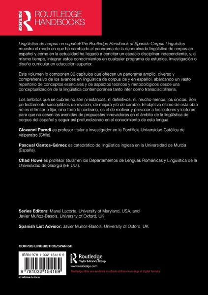 Lingüística de corpus en español / The Routledge Handbook of Spanish Corpus Linguistics shows how the landscape of corpus linguistics in Spanish has changed and how it has become an independent discipline while incorporating this knowledge into any syllabus, research or curriculum design in higher education.