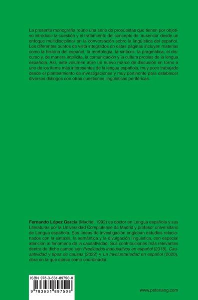 La presente monografía reúne una serie de propuestas que tienen por objetivo introducir la cuestión y el tratamiento del concepto de 'ausencia' desde un enfoque multidisciplinar en la conversación sobre la lingüística del español. Los diferentes puntos de vista integrados en estas páginas incluyen materias como la historia del español, la morfología, la sintaxis, la pragmática, el discurso y, de manera implícita, la comunicación y la cultura propias de la lengua española. Así, este volumen abre un nuevo marco de discusión en torno a uno de los ítems más interesantes de la lengua española, muy poco trabajado desde el planteamiento de investigaciones y muy pertinente para establecer diversos diálogos con otras cuestiones lingüísticas periféricas.