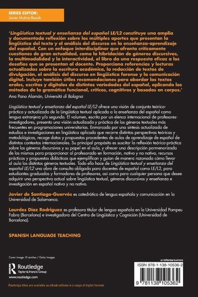 La presente obra presenta, en un solo volumen, una visión actualizada y práctica de los tipos textuales y géneros discursivos de uso más frecuente desde una perspectiva teórico-práctica: presentación, descripción y puesta en práctica es un esquema de trabajo directo y enormemente útil para su aplicación en el aula. El ámbito internacional en el que se mueven los autores le da una amplitud nunca antes recogida en una obra de lingüística textual. Todo ello hace de Lingüística textual y enseñanza del español LE/L2 una obra de consulta obligada para docentes de español como LE/L2, para estudiantes graduados y formadores de profesores, así como para cualquier persona que desee adquirir una perspectiva actual sobre lingüística textual, géneros discursivos y enseñanza e investigación en español nativo y no nativo.