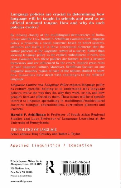By looking closely at the multilingual democracies of India, France and the USA, Harold F. Schiffman examines how language policy is primarily a social construct based on belief systems, attitudes and myths. Linguistic Culture and Language Policy exposes language policy as culture-specific, helping us to understand why language policies evolve the way they do; why they work, or not; and how people's lives are affected by them. These issues will be of specific interest to linguists specialising in multilingual/multicultural societies, bilingual educationalists, curriculum planners and teachers.