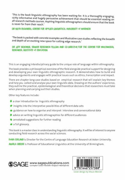Ethnography and Language Linguistic Ethnography Data in Linguistic Ethnography Doing Research in Linguistic Ethnography: Building the Case Case study one: Reflexivity, voice and representation in linguistic ethnography Case study two: Researching feedback conferences in pre-service teacher training Case study three: Ethnography and the workplace Case study four: Ethnography, language and healthcare planning Practical Issues in Linguistic Ethnographic Research Empiricism, ethics and impact Transcription, translation and technology Writing up: genres, writer voice, audience Ways forward