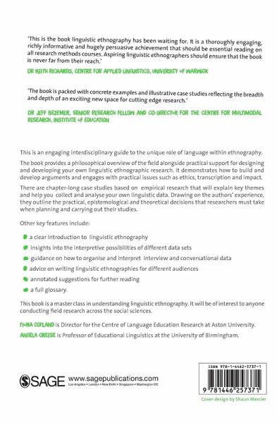 Ethnography and Language Linguistic Ethnography Data in Linguistic Ethnography Doing Research in Linguistic Ethnography: Building the Case Case study one: Reflexivity, voice and representation in linguistic ethnography Case study two: Researching feedback conferences in pre-service teacher training Case study three: Ethnography and the workplace Case study four: Ethnography, language and healthcare planning Practical Issues in Linguistic Ethnographic Research Empiricism, ethics and impact Transcription, translation and technology Writing up: genres, writer voice, audience Ways forward