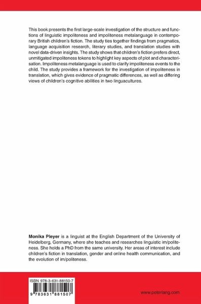 This book presents the first large-scale investigation of the structure and functions of linguistic impoliteness and impoliteness metalanguage in contemporary British children's fiction. The study ties together findings from pragmatics, language acquisition research, literary studies, and translation studies with novel data-driven insights. The study shows that children's fiction prefers direct, unmitigated impoliteness tokens to highlight key aspects of plot and characterisation. Impoliteness metalanguage is used to clarify impoliteness events to the child. The study provides a framework for the investigation of impoliteness in translation, which gives evidence of pragmatic differences, as well as differing views of children's cognitive abilities in two linguacultures.