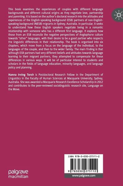 This book examines the experiences of couples with different language backgrounds and different cultural origins as they negotiate love, partnership and parenting. It is based on the author's doctoral research into the attitudes and experiences of the English-speaking background (ESB) partners of non-English-speaking background (NESB) migrants in Sydney, Australia. In particular, it seeks to understand how these English speakers negotiate being in a romantic relationship with someone who has a different first language. It explores how those from an ESB reconcile the negative perspectives of Anglophone culture towards "other" languages, with their desire to be a good partner who respects the linguistic differences in their relationship. The book is organised into six chapters, which move from a focus on the language of the individual, to the languages of the couple, and then to the wider family. The main finding is that although ESB partners had very different beliefs and attitudes towards language learning to their migrant partners, they attempted to compensate for these differences in various ways. It will be of particular interest to students and scholars in the fields of language education, minority languages, and language policy and planning.