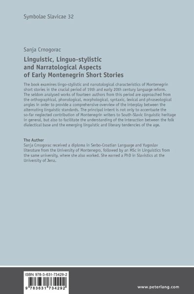 The book examines lingo-stylistic and narratological characteristics of Montenegrin short stories in the crucial period of 19th and early 20th century language reform. The seldom analysed works of fourteen authors from this period are approached from the orthographical, phonological, morphological, syntaxic, lexical and phraseological angles in order to provide a comprehensive overview of the interplay between the alternating linguistic standards. The principal intent is not only to accentuate the so-far neglected contribution of Montenegrin writers to South-Slavic linguistic heritage in general, but also to facilitate the understanding of the interaction between the folk dialectical base and the emerging linguistic and literary tendencies of the age.