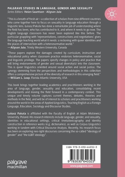 1. Introduction: Language and Sexuality Studies Are Crucial for Inclusive Education.- Part I. Heteronormativity in Learning Materials.- 2. Foreign Language Textbooks and Degrees of Heteronormativity: Representation and Consumption.- 3. Foreign Language Learning and Sexuality-Related Inclusion: A Multimodal Analysis of Representational Practices in the German Textbook Series Navi Englisch.- 4. Heteronormativity and Dictionaries: A Look Back.- Part II. Welcoming Marginalised Voices in the Classroom.- 5. Silences in Spanish Early Childhood Education and Strategies for Inclusion of Marginalized Voices.- 6. Queer Voices in the ESOL Classroom.- Part III. Beyond the Binary.- 7. Transgender Identities in Writing Classes.- 8. The Language of Invisibilization: EFL Students' Inquiry into Male-Directed Sexual Violence.- Part IV. Exploring Intervention: Theory vis-a-vis Practice.- 9. Queering Timespace in Educational LiteracyPractices in Socially Fascist Brazil: An Interventionist-Performative Approach.- 10. Polish LGBT Teachers Talking Sexuality: Glocalized Discourses.- 11. Queering TESOL in International Learning Contexts.- Part V. Beyond Academia: Recommendations for Practitioners.- 12. Changing Perspectives on LGBT Representation in ELT Textbooks.- 13. Reflections on the Co-development of ESOL Teaching Material Exploring LGBT Lives.- 14. Introducing LGBTQ+ Issues: Dynamic Classroom Negotiations for ELT Practitioners.