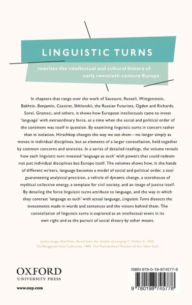 Linguistic Turns rewrites the intellectual and cultural history of early twentieth-century Europe. In chapters that study the work of Saussure, Russell, Wittgenstein, Bakhtin, Benjamin, Cassirer, Shklovskii, the Russian Futurists, Ogden and Richards, Sorel, Gramsci, and others, it shows how European intellectuals came to invest 'language' with extraordinary force, at a time when the social and political order of the continent was itself in question. By examining linguistic turns in concert rather than in isolation, the volume changes the way we see them--no longer simply as moves in individual disciplines, but as elements of a larger constellation, held together by common concerns and anxieties. In a series of detailed readings, the volume reveals how each linguistic turn invested 'language as such' with powers that could redeem not just individual disciplines but Europe itself. It shows how, in the hands of different writers, language becomes a model of social and political order, a tool guaranteeing analytical precision, a vehicle of dynamic change, a storehouse of mythical collective energy, a template for civil society, and an image of justice itself. By detailing the force linguistic turns attribute to language, and the way in which they contrast 'language as such' with actual language, the volume dissects the investments made in words and sentences and the visions behind them. The constellation of linguistic turns is explored as an intellectual event in its own right and as the pursuit of social theory by other means.