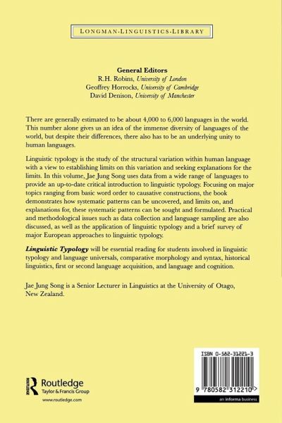 There are generally estimated to be between 4,000 and 6,000 languages in the world. This number alone gives an idea of the immense diversity of languages: at the same time, there also has to be an underlying unity to human languages. Linguistic Typology is the study of the structural similarities between languages, regardless of their history, to establish a classification of languages. It provides an accessible overview of the most prominent areas of study and research in language typology, illustrated with many examples taken from a wide range of languages. Jae Jong Song offers an explanation for the different ways in which languages behave, and considers why languages are the way they are.