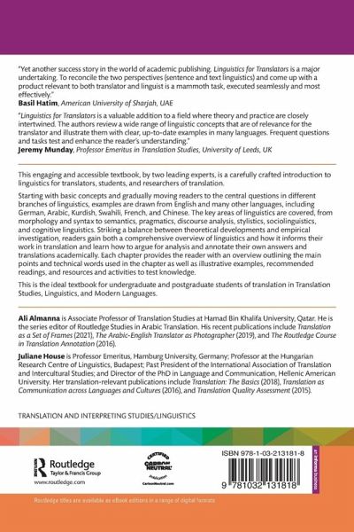 Linguistics for Translators by Almanna and House provides a ground-breaking contribution to translation studies. It reinstates linguistics to the forefront of the field, by demonstrating its crucial importance for understanding what goes on in translation. This book is a must-read for academics, teachers, practitioners and students.