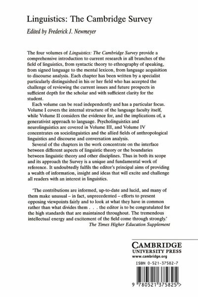 Linguistics: The Cambridge Survey is a comprehensive introduction to current research in all branches of the field of linguistics, from syntactic theory to ethnography of speaking, from signed language to the mental lexicon, from language acquisition to discourse analysis. Each chapter has been written by a specialist particularly distinguished in his or her field who has accepted the challenge of reviewing the current issues and future prospects in sufficient depth for the scholar and with sufficient clarity for the student. Each volume can be read independently and has a particular focus. Volume I covers the internal structure of the language faculty itself, while Volume II considers the evidence for, and the implications of, a generativist approach to language. Psycholinguistics and neurolinguistics are covered in Volume III, and Volume IV concentrates on sociolinguistics and the allied fields of anthropological linguistics and discourse and conversation analysis. Several of the chapters in the work concentrate on the interface between different aspects of linguistic theory or the boundaries between linguistic theory and other disciplines. Thus in both its scope and in its approach the Survey is a unique and fundamental work of reference. It undoubtedly fulfils the editor's principal aim of providing a wealth of information, insight and ideas that will excite and challenge all readers with an interest in linguistics. 'The contributions are informed, up-to-date and lucid, and many of them make unusual - in fact, unprecedented - efforts to present opposing viewpoints fairly and to look at what they have in common rather than at what divides them. ...The mixture of detached overviews and strongly argued positions works very well, in my view, and the editor is to be congratulated for the high standards that are maintained throughout. The tremendous intellectual energy and excitement of the field come through strongly, and I shan't hesitate to recommend many of the chapters to students.' -- The Times Higher Education Supplement