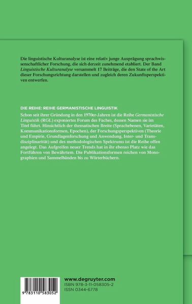 Die linguistische Kulturanalyse ist eine relativ junge Ausprägung sprachwissenschaftlicher Forschung, die sich derzeit zunehmend etabliert. Sie geht von der Annahme aus, dass sich Sprachliches und Kulturelles gegenseitig hervorbringen, und untersucht dieses Verhältnis theoretisch und empirisch. Der Band Linguistische Kulturanalyse versammelt 17 Beiträge, die sich einerseits mit grundlegenden kulturanalytischen Konzepten und Annahmen auseinandersetzen und andererseits das Potenzial der linguistischen Kulturanalyse an lexikalischen, morphosyntaktischen, praktikenbezogenen, textuellen und diskursiven Beispielen des Sprachgebrauchs veranschaulichen. Damit stellt der Band den State of the Art der linguistischen Kulturanalyse dar und entwirft zugleich deren Zukunftsperspektiven.