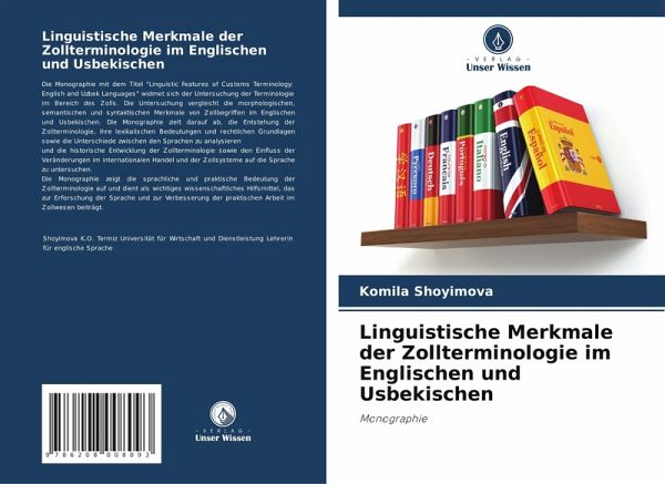 Die Monographie mit dem Titel "Linguistic Features of Customs Terminology: English and Uzbek Languages" widmet sich der Untersuchung der Terminologie im Bereich des Zolls. Die Untersuchung vergleicht die morphologischen, semantischen und syntaktischen Merkmale von Zollbegriffen im Englischen und Usbekischen. Die Monographie zielt darauf ab, die Entstehung der Zollterminologie, ihre lexikalischen Bedeutungen und rechtlichen Grundlagen sowie die Unterschiede zwischen den Sprachen zu analysierenund die historische Entwicklung der Zollterminologie sowie den Einfluss der Veränderungen im internationalen Handel und der Zollsysteme auf die Sprache zu untersuchen.Die Monographie zeigt die sprachliche und praktische Bedeutung der Zollterminologie auf und dient als wichtiges wissenschaftliches Hilfsmittel, das zur Erforschung der Sprache und zur Verbesserung der praktischen Arbeit im Zollwesen beiträgt.