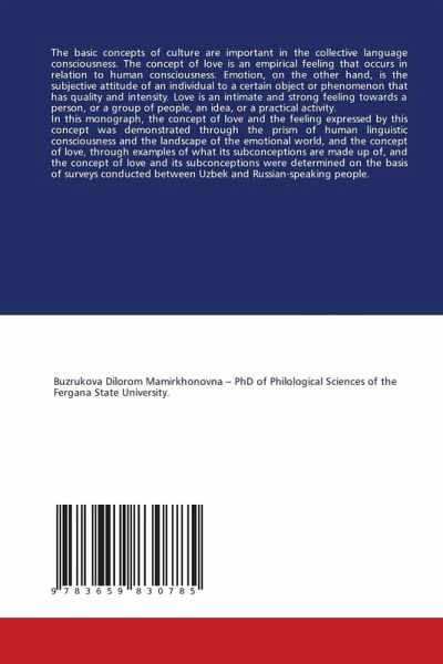 The basic concepts of culture are important in the collective language consciousness. The concept of love is an empirical feeling that occurs in relation to human consciousness. Emotion, on the other hand, is the subjective attitude of an individual to a certain object or phenomenon that has quality and intensity. Love is an intimate and strong feeling towards a person, or a group of people, an idea, or a practical activity.In this monograph, the concept of love and the feeling expressed by this concept was demonstrated through the prism of human linguistic consciousness and the landscape of the emotional world, and the concept of love, through examples of what its subconceptions are made up of, and the concept of love and its subconceptions were determined on the basis of surveys conducted between Uzbek and Russian-speaking people.