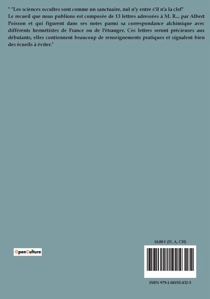 " "Les sciences occultes sont comme un sanctuaire, nul n'y entre s'il n'a la clef" Le recueil que nous publions est composée de 13 lettres adressées à M. R... par Albert Poisson et qui figurent dans ses notes parmi sa correspondance alchimique avec différents hermétistes de France ou de l'étranger. Ces lettres seront précieuses aux débutants, elles contiennent beaucoup de renseignements pratiques et signalent bien des écueils à éviter."