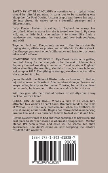 SAVED BY MY BLACKGUARD: A vacation on a tropical island should be blissful paradise. It turns out to be something else altogether for Paul Dewitt. A storm erupts and throws his entire life into chaos. He wakes up to a beautiful stranger and a different time. Lady Evelyn Beckett is sailing to England to marry her betrothed. When a storm hits she is tossed overboard. By sheer will, and a little luck, she makes it to shore. She finds a handsome man wandering the beach, and he's both confusing and odd? Together Paul and Evelyn rely on each other to survive the raging storm, villainous pirates, and a little bit of culture shock. Can they get past each other's differences and learn to trust each other and find love. SEARCHING FOR MY ROGUE: Alys Dewitt's sister is getting married. Lucky for her she gets to be the maid of honor in a Regency themed wedding at an actual Ducal estate in England. While attending the wedding, she falls through a time hole and wakes up in 1815. Everything is strange, wondrous, not at all as she expected it to be. James Kendall, the Duke of Weston returns from war to find an injured woman on his estate. She mumbles strange phrases and keeps calling him by another name. Thinking her a bit mad from her wounds, he takes her to the manor and calls for a doctor. Will they give into their mutual desires, or will Alys find a way back to her own time? SEDUCTIO OF MY RAKE: What's a man to do when he's attracted to a woman he can't have? Bradford Kendall, the Duke of Weston, is in that very predicament, when his brother's ex-wife shows up at his estate. Regina has always held an unnerving lure for him, and it's a nuisance to have to deal with it, and her. Regina Dewitt wants to find out what happened to her sister. The best place to start her search is where she disappeared—Weston Manor. It's been a year, and clues will be scarce, but she's determined. She didn't count on how tempting the estate's resident duke would be... As they begin the search together, the question remains: Can they fight their growing desire?