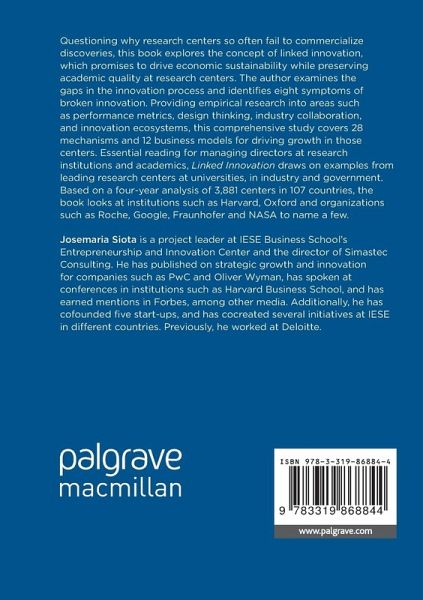 Questioning why research centers so often fail to commercialize discoveries, this book explores the concept of linked innovation, which promises to drive economic sustainability while preserving academic quality at research centers. The author examines the gaps in the innovation process and identifies eight symptoms of broken innovation. Providing empirical research into areas such as performance metrics, design thinking, industry collaboration, and innovation ecosystems, this comprehensive study covers 28 mechanisms and 12 business models for driving growth in those centers. Essential reading for managing directors at research institutions and academics, Linked Innovation draws on examples from leading research centers at universities, in industry and government. Based on a four-year analysis of 3,881 centers in 107 countries, the book looks at institutions such as Harvard, Oxford and organizations such as Roche, Google, Fraunhofer and NASA to name a few.