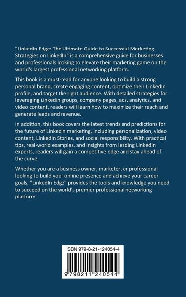 "LinkedIn Edge: The Ultimate Guide to Successful Marketing Strategies on LinkedIn" is a comprehensive guide for businesses and professionals looking to elevate their marketing game on the world's largest professional networking platform. This book is a must-read for anyone looking to build a strong personal brand, create engaging content, optimize their LinkedIn profile, and target the right audience. With detailed strategies for leveraging LinkedIn groups, company pages, ads, analytics, and video content, readers will learn how to maximize their reach and generate leads and revenue. In addition, this book covers the latest trends and predictions for the future of LinkedIn marketing, including personalization, video content, LinkedIn Stories, and social responsibility. With practical tips, real-world examples, and insights from leading LinkedIn experts, readers will gain a competitive edge and stay ahead of the curve. Whether you are a business owner, marketer, or professional looking to build your online presence and achieve your career goals, "LinkedIn Edge" provides the tools and knowledge you need to succeed on the world's premier professional networking platform.