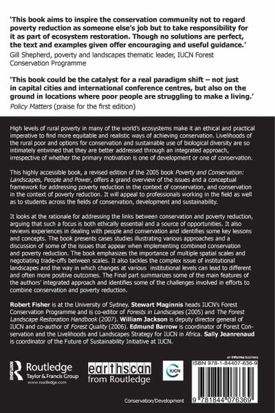 'This book aims to inspire the conservation community not to regard poverty reduction as someone else's job but to take responsibility for it as part of ecosystem restoration. Though no solutions are perfect,the text and examples given offer encouraging and useful guidance.' Gill Shepherd, poverty and landscapes thematic leader, IUCN Forest Conservation Programme. 'This book could be the catalyst for a real paradigm shift - not just in capital cities and international conference centres, but also on the ground in locations where poor people are struggling to make a living.' Policy Matters (praise for the first edition). High levels of rural poverty in many of the world's ecosystems make it an ethical and practical imperative to find more equitable and realistic ways of achieving conservation. Livelihoods of the rural poor and options for conservation and sustainable use of biological diversity are so intimately entwined that they are better addressed through an integrated approach, irrespective of whether the primary motivation is one of development or one of conservation. This highly accessible book, a revised edition of the 2005 book Poverty and Conservation: Landscapes, People and Power, offers a grand overview of the issues and a conceptual framework for addressing poverty reduction in the context of conservation, and conservation in the context of poverty reduction. It will appeal to professionals working in the field as well as to students across the fields of conservation, development and sustainability. It looks at the rationale for addressing the links between conservation and poverty reduction, arguing that such a focus is both ethically essential and a source of opportunities. It alsoreviews experiences in dealing with people and conservation and identifies some key lessons and concepts. The book presents cases studies illustrating various approaches and a discussion of some of the issues that appear when implementing combined conservation and poverty reduction. The book emphasizes the importance of multiple spatial scales and negotiating trade-offs between scales. It also tackles the complex issue of institutional landscapes and the way in which changes at various institutional levels can lead to different and often more positive outcomes. The Final part summarizes some of the main features of the authors' integrated approach and identifies some of the challenges involved in efforts to combine conservation and poverty reduction. Published with IUCN - The World Conservation Union.
