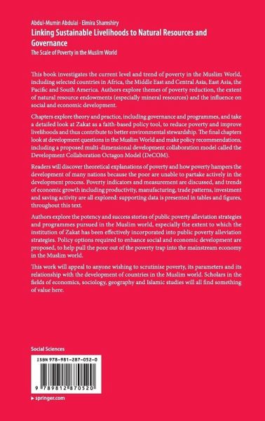 Preface.- Acknowledgement.- List of tables.- List of figures.- List of boxes.- Chapter 1: Introduction.- Chapter 2: Theory and practice on poverty - Natural resources and governance.- Chapter 3: Techniques and methods used to investigate muslim world's poverty.- Chapter 4: The incidence and trend of poverty in the muslim world.- Chapter 5: Natural resource endowments and development trend in the muslim world.- Chapter 6: Governance and poverty alleviation in the muslim world.- Chapter 7: Zakat as policy tool to reduce poverty and improve livelihoods.- Chapter 8: Addressing pertinent development questions in the muslim world.- Chapter 9: Toward a practicable development collaboration.- References.