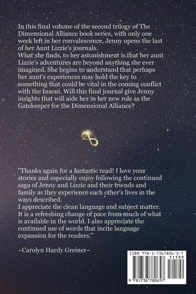 In this final volume of the second trilogy of The Dimensional Alliance book series, with only one week left in her convalescence, Jenny opens the last of her Aunt Lizzie's journals. What she finds, to her astonishment is that her aunt Lizzie's adventures are beyond anything she ever imagined. She begins to understand that perhaps her aunt's experiences may hold the key to something that could be vital in the coming conflict with the Inseni. Will this final journal give Jenny insights that will aide her in her new role as the Gatekeeper for the Dimensional Alliance?