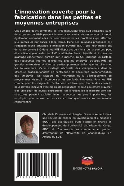 Cet ouvrage décrit comment les PME manufacturières sud-africaines sans département de R&D peuvent innover avec moins de ressources. Il décrit également comment elles peuvent surmonter les problèmes qui affectent leur succès et leur survie à long terme. L'une des solutions proposées est l'adoption d'une stratégie d'innovation ouverte (SIO). Les recherches ont démontré qu'une SIO dans les PME disposant de moins de ressources peut être efficace pour aider les PME à atteindre leurs objectifs et à créer un avantage concurrentiel durable sur le marché. La SIO implique un partage des ressources internes et externes avec les employés, d'autres PME, de grandes entreprises et d'autres parties prenantes telles que les clients et les fournisseurs. Cette stratégie nécessite des changements dans la structure organisationnelle de l'entreprise et encourage l'autonomisation des employés, les facteurs de motivation et le développement de programmes visant à récompenser les employés innovants. Pour les PME comme pour les dirigeants d'entreprise, ce livre peut fournir des conseils pour devenir innovant avec moins de ressources. Il peut également s'avérer très utile pour les jeunes entreprises, car il rationalise la manière dont ces structures peuvent exploiter leurs ressources les plus importantes, les employés, pour innover et survivre en tant que novices sur un marché concurrentiel.