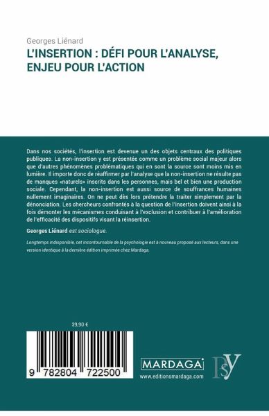 Dans nos sociétés, l¿insertion est devenue un des objets centraux des politiques publiques. La non-insertion y est présentée comme un problème social majeur alors que d¿autres phénomènes problématiques qui en sont la source sont moins mis en lumière. Il importe donc de réaffirmer par l¿analyse que la non-insertion ne résulte pas de manques "naturels" inscrits dans les personnes, mais bel et bien une production sociale. Cependant, la non-insertion est aussi source de souffrances humaines nullement imaginaires. On ne peut dès lors prétendre la traiter simplement par la dénonciation. Les chercheurs confrontés à la question de l¿insertion doivent ainsi à la fois démonter les mécanismes conduisant à l¿exclusion et contribuer à l¿amélioration de l¿efficacité des dispositifs visant la réinsertion. Ont collaboré à la réalisation de cet ouvrage : Bernard Delvaux, Anne Deprez, Donatienne Desmette, Valérie Dumont, Bruno Gilain, Caroline Gaussin, Ginette Herman, Bertrand Jadoul, Christine Jaminon, Catherine Lefèvre, Marthe Nyssens, Francesca Petrella, David van Ypersele. Georges Liénard est sociologue.
