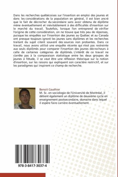 Dans les recherches québécoises sur l'insertion en emploi des jeunes et dans les considérations de la population en général, il est bien ancré que le fait de décrocher du secondaire sans avoir obtenu de diplôme mène éventuellement et inévitablement à des difficultés d'insertion sur le marché du travail. Toutefois, lorsque l'on entreprend de vérifier l'origine de cette considération, on ne trouve que très peu de réponses, puisque les enquêtes sur l'insertion des jeunes au Québec et au Canada ont presque toujours ignoré les jeunes sans diplômes et les recherches traitant du sujet citent souvent des sources non probantes. Dans ce travail, nous avons utilisé une enquête récente qui n'est pas restreinte aux seuls diplômés pour comparer l'insertion des jeunes décrocheurs à celle de certaines catégories de diplômés. L'intérêt de ce travail ne s'arrête pas à la comparaison statistique entre les deux groupes de jeunes à l'étude, il se veut être une réflexion théorique sur la notion d'insertion, sur les raisons qui expliquent son caractère restrictif, et sur les paradigmes qui inspirent ce champ de recherche.