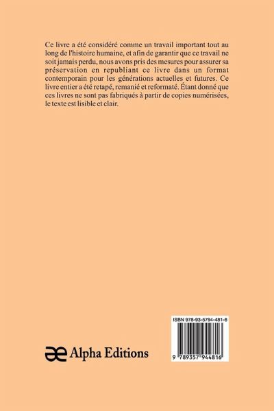 L'institution des enfans, ou conseils d'un père à son fils; Imités des vers que Muret a écrits en latin, pour l'usage de son neveu, et qui peuvent servir à tous les jeunes écoliers, est un livre classique et rare, qui a été considéré comme important tout au long de l'histoire de l'humanité, et pour que cet ouvrage ne soit jamais oublié, chez Alpha Editions, nous avons fait des efforts pour sa préservation en rééditant ce livre dans un format moderne pour les générations présentes et futures. . Tout ce livre a été reformaté, retapé et repensé. Ces livres ne sont pas constitués de copies numérisées de leur uvre originale et leur texte est donc clair et lisible. Ce volume remarquable s'inscrit dans les genres de History General and Eastern Hemisphere France, Andorra, Monaco