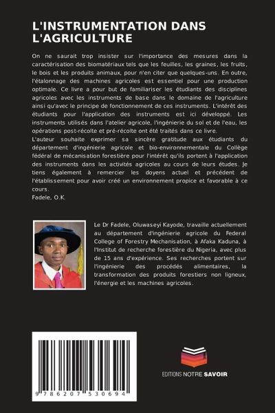 On ne saurait trop insister sur l'importance des mesures dans la caractérisation des biomatériaux tels que les feuilles, les graines, les fruits, le bois et les produits animaux, pour n'en citer que quelques-uns. En outre, l'étalonnage des machines agricoles est essentiel pour une production optimale. Ce livre a pour but de familiariser les étudiants des disciplines agricoles avec les instruments de base dans le domaine de l'agriculture ainsi qu'avec le principe de fonctionnement de ces instruments. L'intérêt des étudiants pour l'application des instruments est ici développé. Les instruments utilisés dans l'atelier agricole, l'ingénierie du sol et de l'eau, les opérations post-récolte et pré-récolte ont été traités dans ce livre.L'auteur souhaite exprimer sa sincère gratitude aux étudiants du département d'ingénierie agricole et bio-environnementale du Collège fédéral de mécanisation forestière pour l'intérêt qu'ils portent à l'application des instruments dans les activités agricoles au cours de leurs études. Je tiens également à remercier les doyens actuel et précédent de l'établissement pour avoir créé un environnement propice et favorable à ce cours.Fadele, O.K.