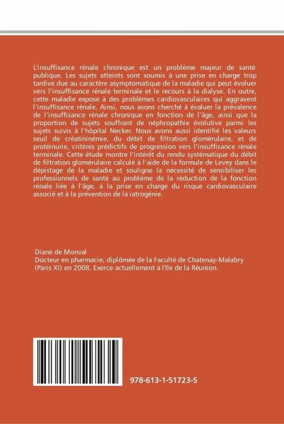 L'insuffisance rénale chronique est un problème majeur de santé publique. Les sujets atteints sont soumis à une prise en charge trop tardive due au caractère asymptomatique de la maladie qui peut évoluer vers l'insuffisance rénale terminale et le recours à la dialyse. En outre, cette maladie expose à des problèmes cardiovasculaires qui aggravent l'insuffisance rénale. Ainsi, nous avons cherché à évaluer la prévalence de l'insuffisance rénale chronique en fonction de l'âge, ainsi que la proportion de sujets souffrant de néphropathie évolutive parmi les sujets suivis à l'hôpital Necker. Nous avons aussi identifié les valeurs seuil de créatininémie, du débit de filtration glomérulaire, et de protéinurie, critères prédictifs de progression vers l'insuffisance rénale terminale. Cette étude montre l'intérêt du rendu systématique du débit de filtration glomérulaire calculé à l'aide de la formule de Levey dans le dépistage de la maladie et souligne la nécessité de sensibiliser les professionnels de santé au problème de la réduction de la fonction rénale liée à l'âge, à la prise en charge du risque cardiovasculaire associé et à la prévention de la iatrogénie.