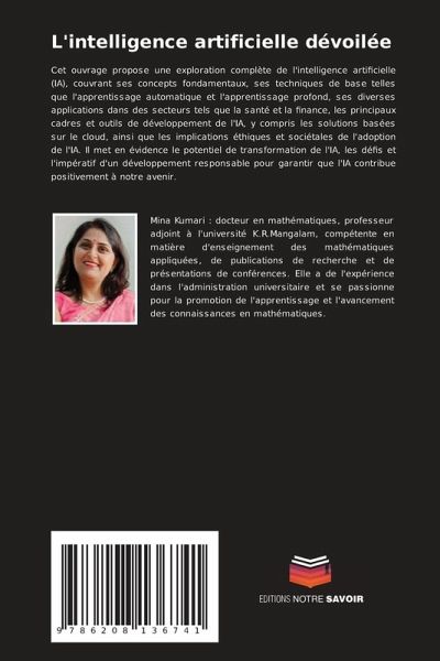 Cet ouvrage propose une exploration complète de l'intelligence artificielle (IA), couvrant ses concepts fondamentaux, ses techniques de base telles que l'apprentissage automatique et l'apprentissage profond, ses diverses applications dans des secteurs tels que la santé et la finance, les principaux cadres et outils de développement de l'IA, y compris les solutions basées sur le cloud, ainsi que les implications éthiques et sociétales de l'adoption de l'IA. Il met en évidence le potentiel de transformation de l'IA, les défis et l'impératif d'un développement responsable pour garantir que l'IA contribue positivement à notre avenir.