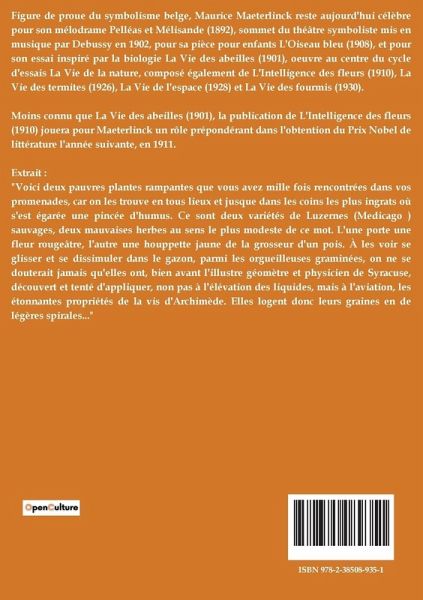 Figure de proue du symbolisme belge, Maurice Maeterlinck reste aujourd'hui célèbre pour son mélodrame Pelléas et Mélisande (1892), sommet du théâtre symboliste mis en musique par Debussy en 1902, pour sa pièce pour enfants L'Oiseau bleu (1908), et pour son essai inspiré par la biologie La Vie des abeilles (1901), oeuvre au centre du cycle d'essais La Vie de la nature, composé également de L'Intelligence des fleurs (1910), La Vie des termites (1926), La Vie de l'espace (1928) et La Vie des fourmis (1930). Moins connu que La Vie des abeilles (1901), la publication de L'Intelligence des fleurs (1910) jouera pour Maeterlinck un rôle prépondérant dans l'obtention du Prix Nobel de littérature l'année suivante, en 1911. Extrait : "Voici deux pauvres plantes rampantes que vous avez mille fois rencontrées dans vos promenades, car on les trouve en tous lieux et jusque dans les coins les plus ingrats où s'est égarée une pincée d'humus. Ce sont deux variétés de Luzernes (Medicago ) sauvages, deux mauvaises herbes au sens le plus modeste de ce mot. L'une porte une fleur rougeâtre, l'autre une houppette jaune de la grosseur d'un pois. À les voir se glisser et se dissimuler dans le gazon, parmi les orgueilleuses graminées, on ne se douterait jamais qu'elles ont, bien avant l'illustre géomètre et physicien de Syracuse, découvert et tenté d'appliquer, non pas à l'élévation des liquides, mais à l'aviation, les étonnantes propriétés de la vis d'Archimède. Elles logent donc leurs graines en de légères spirales..."