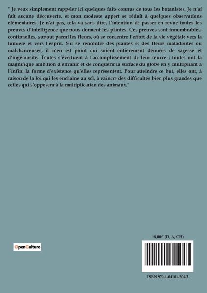 " Je veux simplement rappeler ici quelques faits connus de tous les botanistes. Je n¿ai fait aucune découverte, et mon modeste apport se réduit à quelques observations élémentaires. Je n¿ai pas, cela va sans dire, l¿intention de passer en revue toutes les preuves d¿intelligence que nous donnent les plantes. Ces preuves sont innombrables, continuelles, surtout parmi les fleurs, où se concentre l¿effort de la vie végétale vers la lumière et vers l¿esprit. S¿il se rencontre des plantes et des fleurs maladroites ou malchanceuses, il n¿en est point qui soient entièrement dénuées de sagesse et d¿ingéniosité. Toutes s¿évertuent à l¿accomplissement de leur ¿uvre ; toutes ont la magnifique ambition d¿envahir et de conquérir la surface du globe en y multipliant à l¿infini la forme d¿existence qüelles représentent. Pour atteindre ce but, elles ont, à raison de la loi qui les enchaîne au sol, à vaincre des difficultés bien plus grandes que celles qui s¿opposent à la multiplication des animaux."