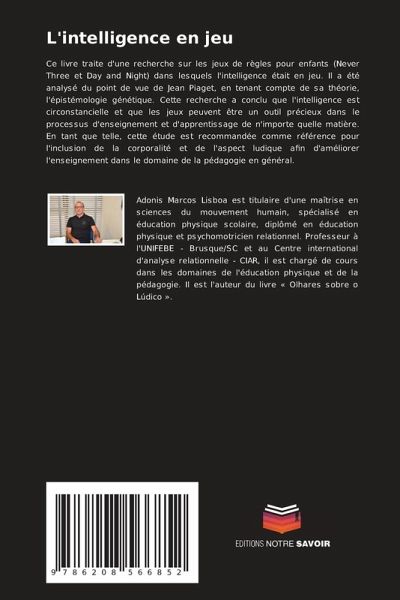 Ce livre traite d'une recherche sur les jeux de règles pour enfants (Never Three et Day and Night) dans lesquels l'intelligence était en jeu. Il a été analysé du point de vue de Jean Piaget, en tenant compte de sa théorie, l'épistémologie génétique. Cette recherche a conclu que l'intelligence est circonstancielle et que les jeux peuvent être un outil précieux dans le processus d'enseignement et d'apprentissage de n'importe quelle matière. En tant que telle, cette étude est recommandée comme référence pour l'inclusion de la corporalité et de l'aspect ludique afin d'améliorer l'enseignement dans le domaine de la pédagogie en général.